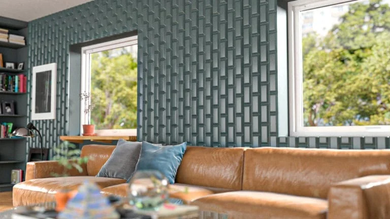 Neste ambiente, os lambris modelo SENSE foram usados para decorar uma parede de uma sala.