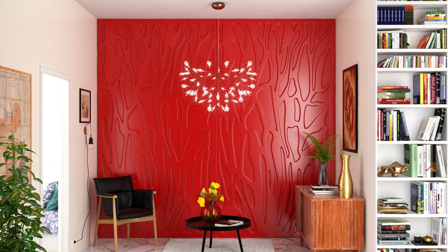 A linha tramezzo de painéis de PET tem grande variedade de modelos e cores. Fixados através de um sistema de velcro ou cola podem ser cortados no local para passagem de fiação, colocação de espelhos de tomadas e outros fins. Os painéis decorativos tramezzo são feitos em MDF e revestido com nossa resina PET.